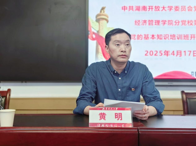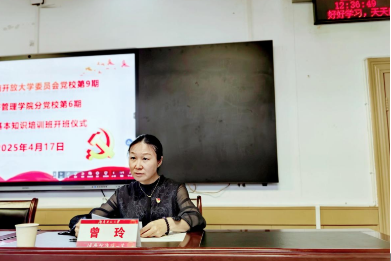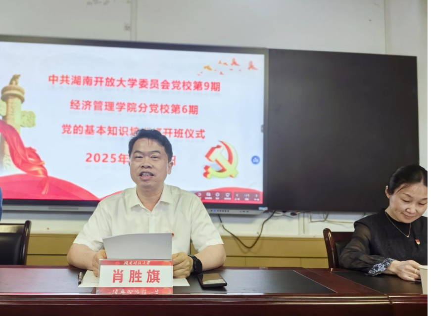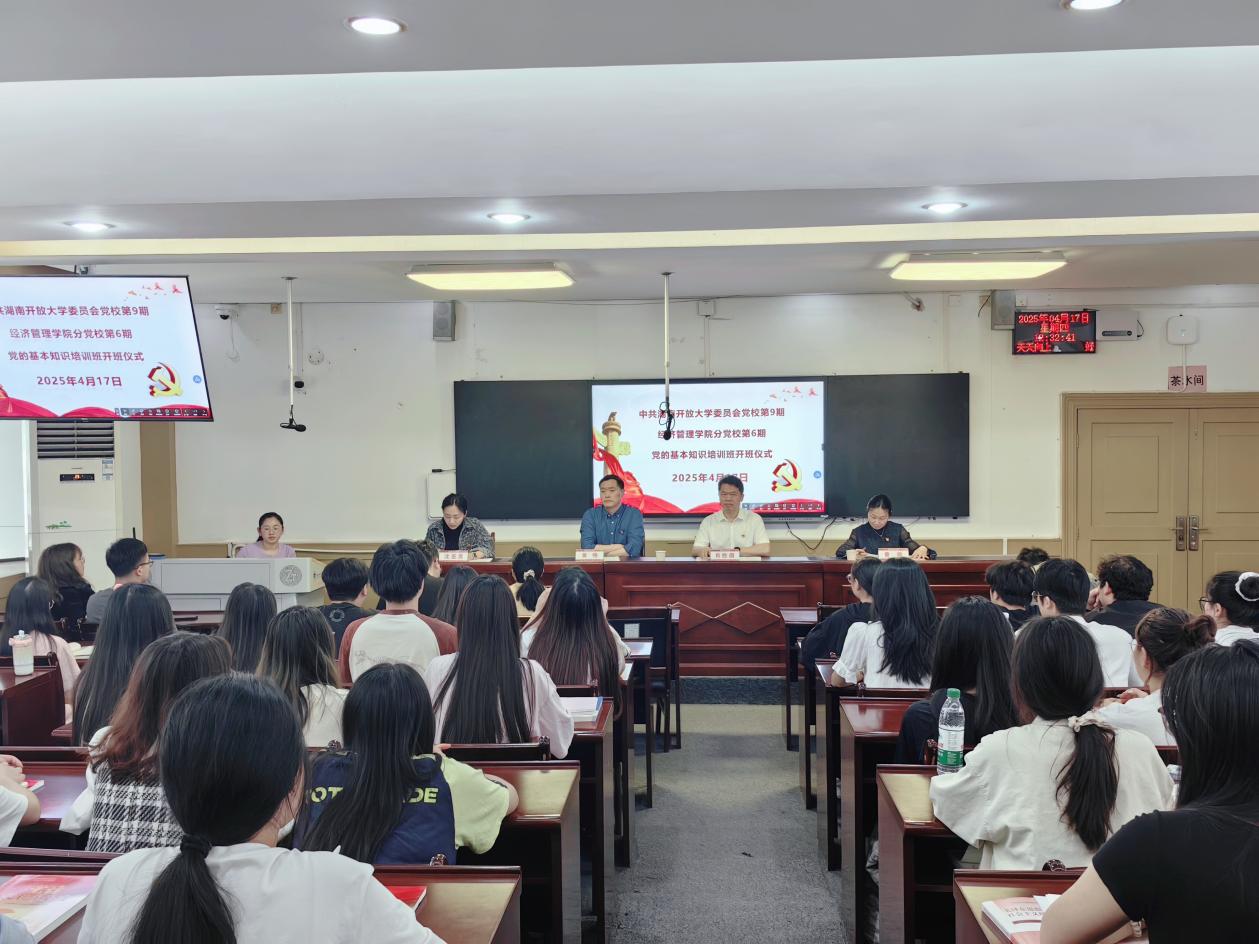 2025年4月17日中午12:30,经济管理香蕉视频黄片分党校第6期党的基本知识培训班在教学楼230室顺利举行开班仪式,香蕉视频黄片党委书记肖胜旗,院党委副书记,院长黄明,院党委委员,副院长曾玲以及全体辅导员和党训班学员出席开班仪式 香蕉91视频APP,院党委委员,学工办副主任沈亚男主持开班仪式。