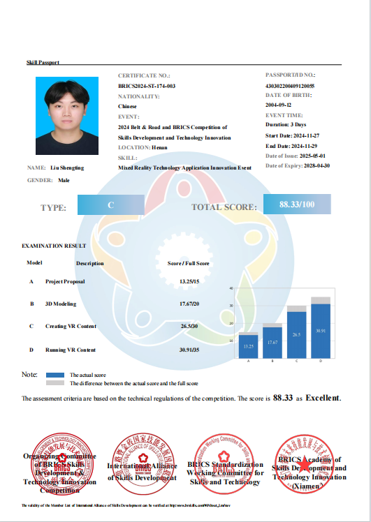 近日,香蕉91视频APP信息工程香蕉视频黄片数字媒体技术专业群传来喜讯,2022级数字媒体技术专业学生戴佳乐、刘晟庭在李婷妤、周知两位老师的指导下,顺利通过了“C级技能护照”认证。该认证由金砖国家工商理事会等权威机构联合颁发,旨在评估选手在混合现实技术应用等领域的实践创新能力与国际化职业竞争力。