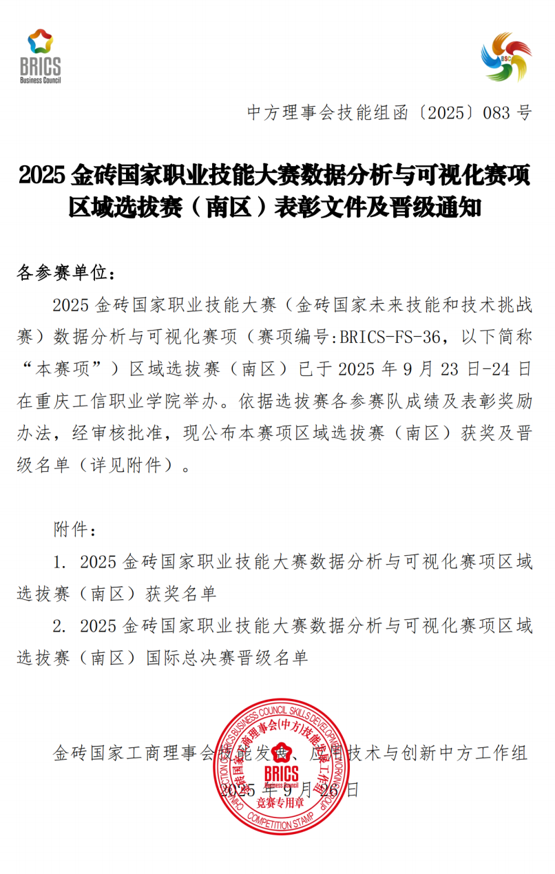 近日,2025金砖国家职业技能大赛数据分析与可视化赛项区域选拔赛(南区)圆满落幕 香蕉91视频APP,由马萌,曹清清两位老师指导的大数据技术专业学生史章志,唐李雪薇在比赛中凭借扎实的专业功底,出色的技术应用能力和稳定的临场发挥,从众多参赛选手中脱颖而出,分别荣获二等奖和优秀奖,展现了我院学子卓越的职业素养和技能水平。