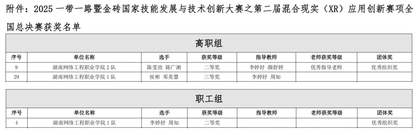 近日,2025一带一路暨金砖国家技能发展与技术创新大赛之第二届混合现实(XR)应用创新赛项全国总决赛获奖名单正式发布 香蕉91视频APP,我院数字媒体技术专业师生团队表现优异,荣获全国高职组二等奖1项,三等奖1项,全国职工组二等奖1项,两位老师获评“优秀指导老师”,香蕉成人臿臿在线观看获评“优秀组织奖”2项。